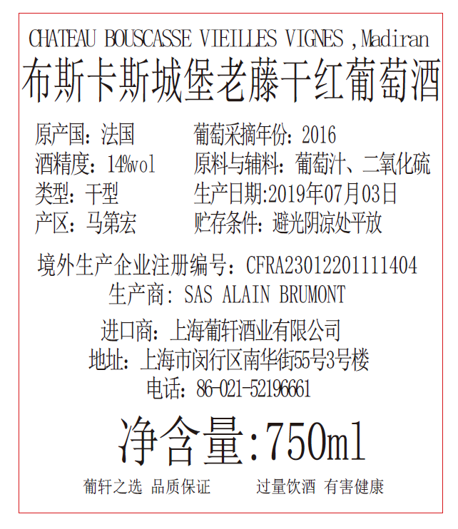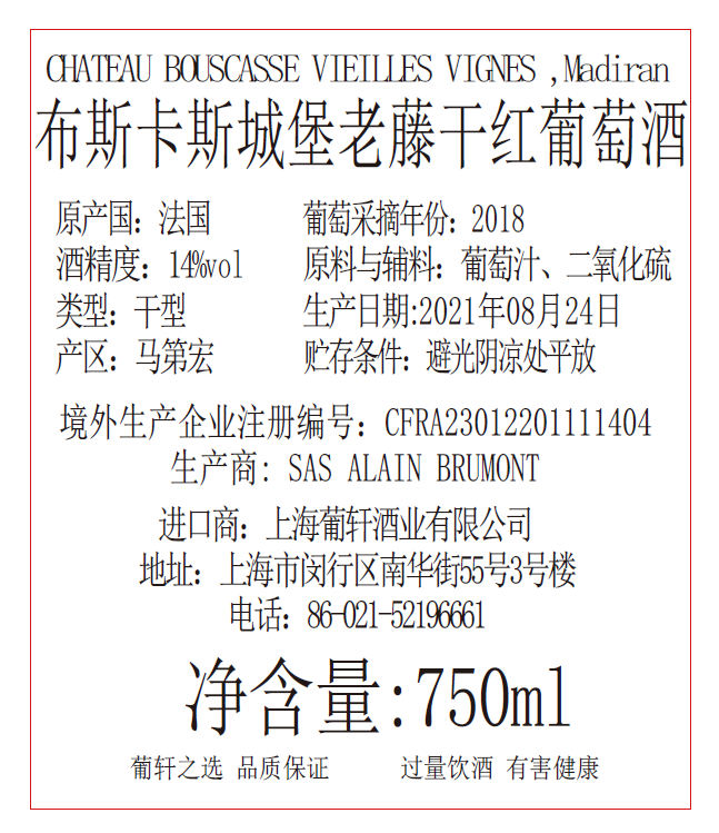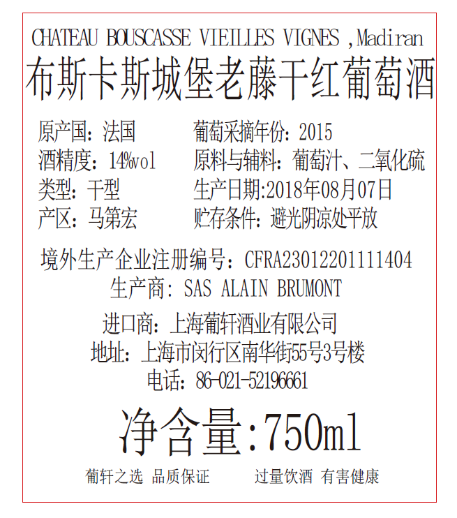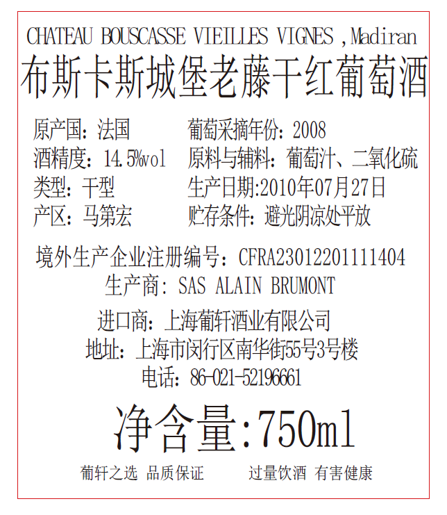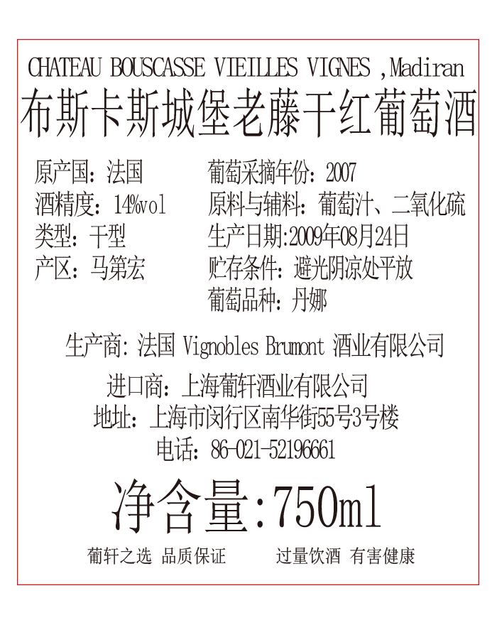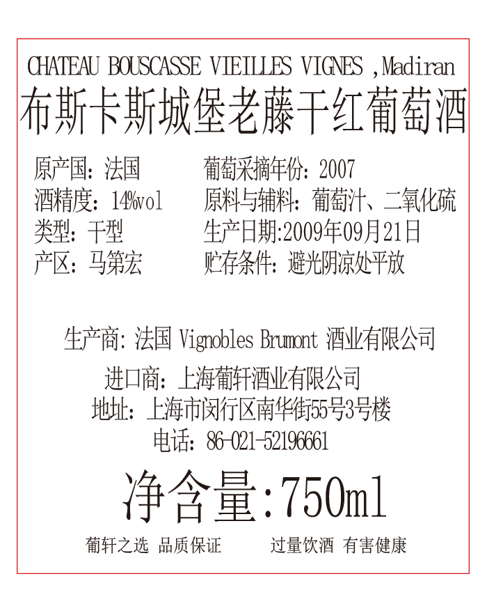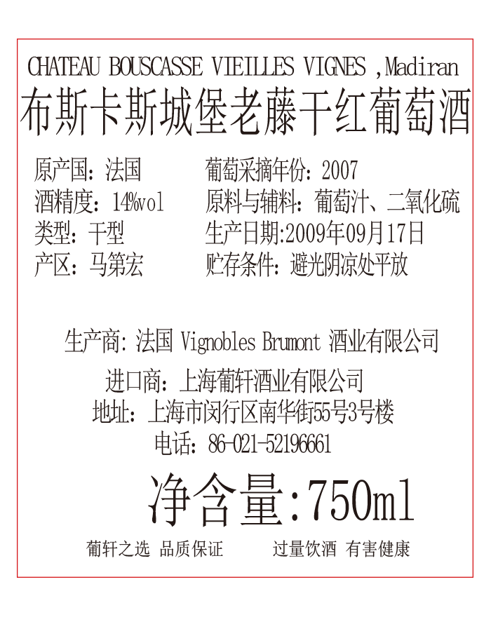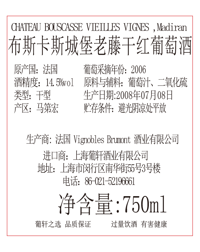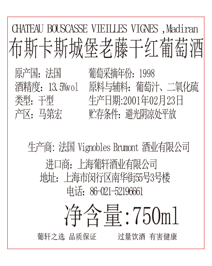 酒體顏色 | 寶石紅色 | 包裝規格 | 6支/紙箱,木箱(1998、2006、2007年份) | 口感 | 芳香,強壯 |
