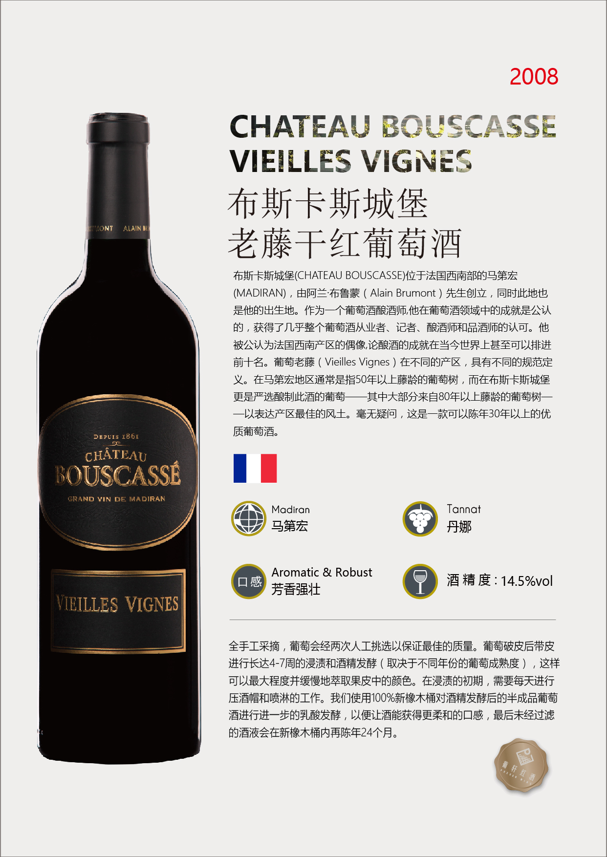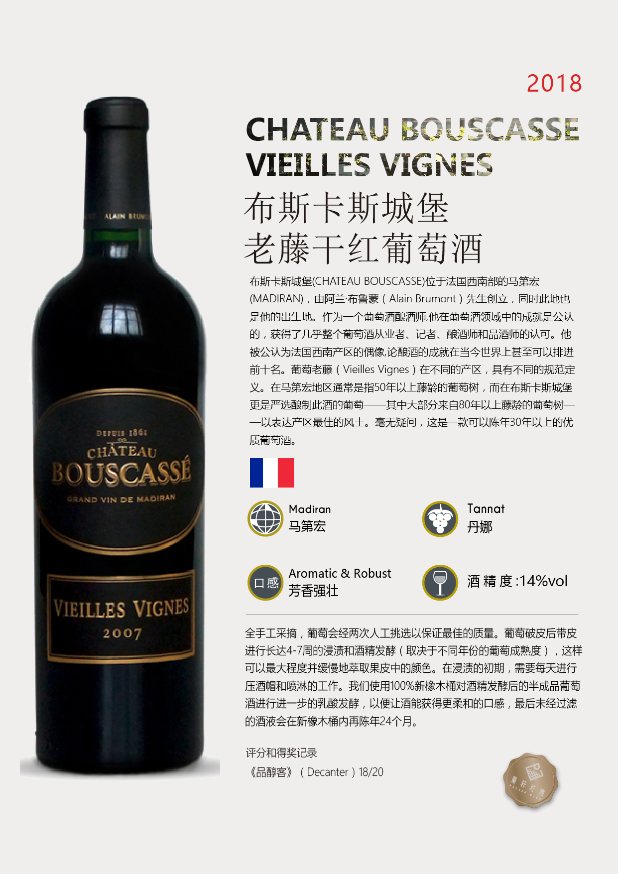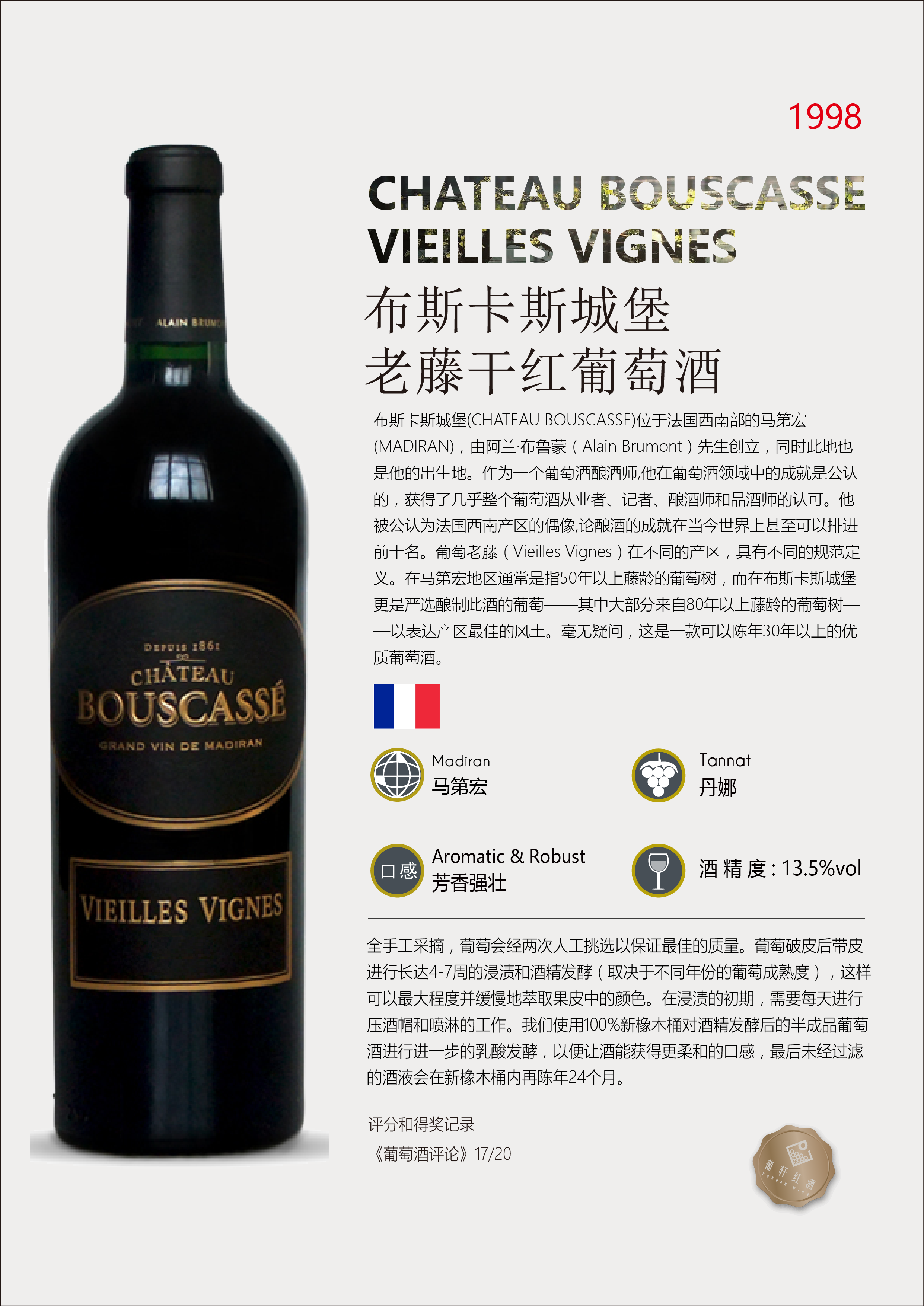賣點 | 50到100年的老藤。 橡木桶陳釀14到16個月(100%新橡木桶) | 級別 | AOC | 酸度 | 中等 |