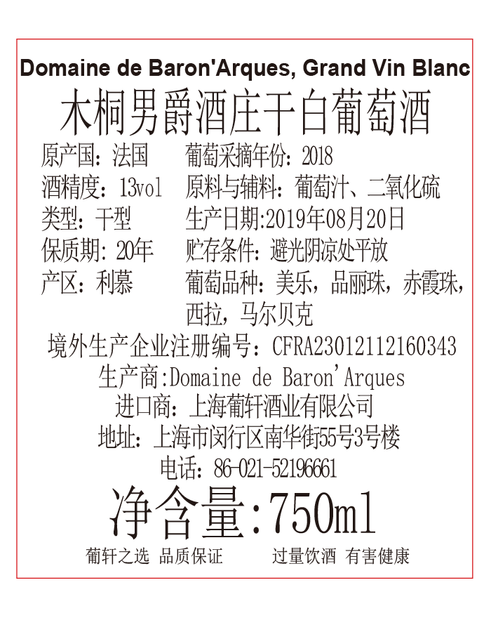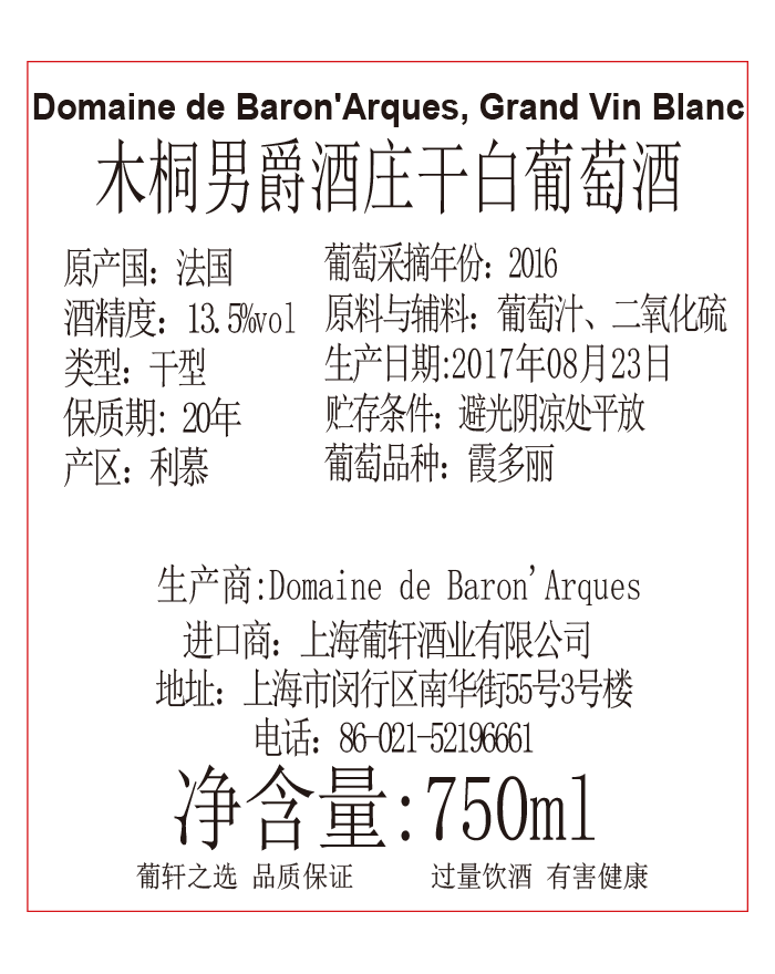 酒體顏色 | 淡黃色 | 包裝規格 | 6/木箱 | 口感 | 芳香,醇厚 |