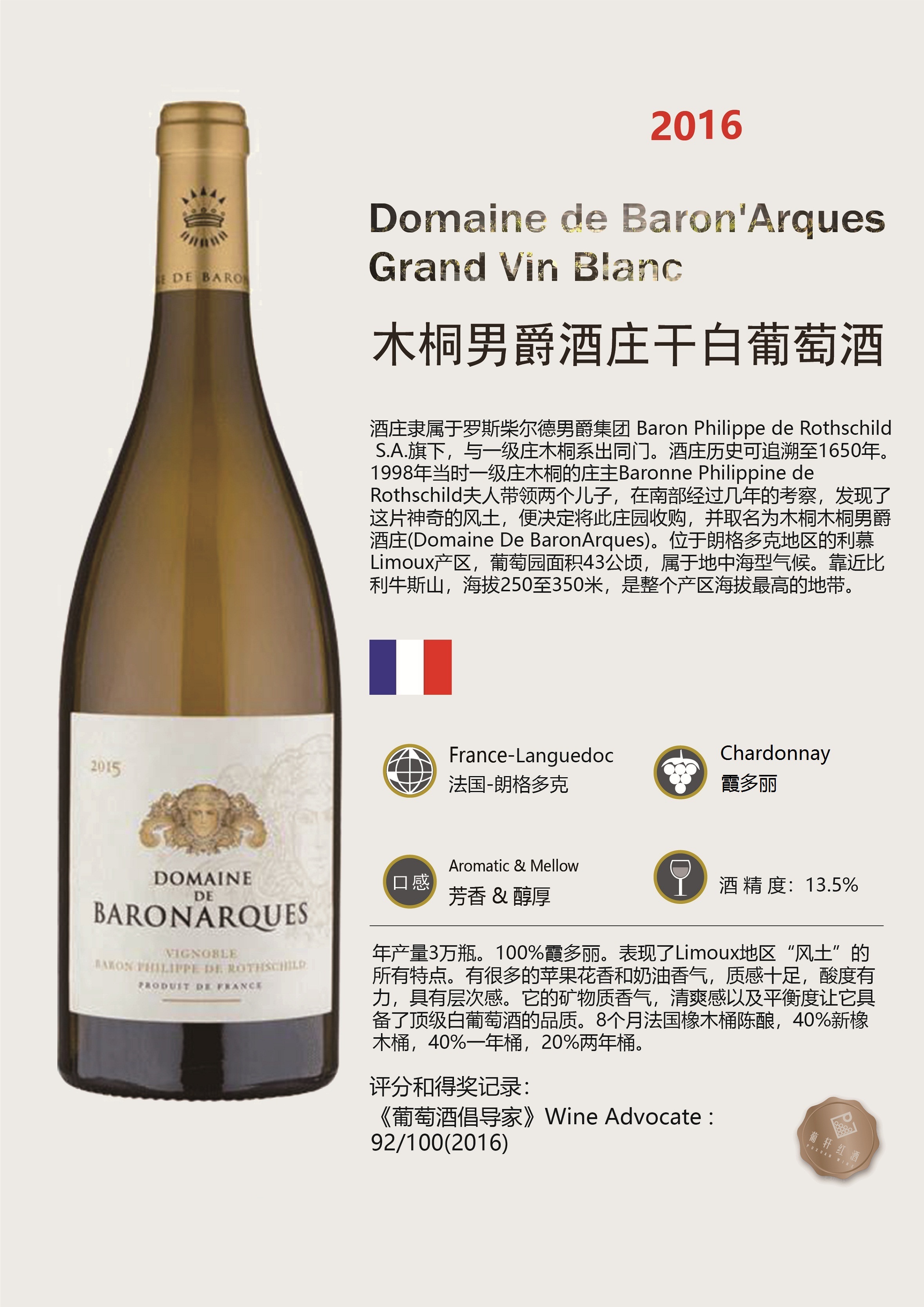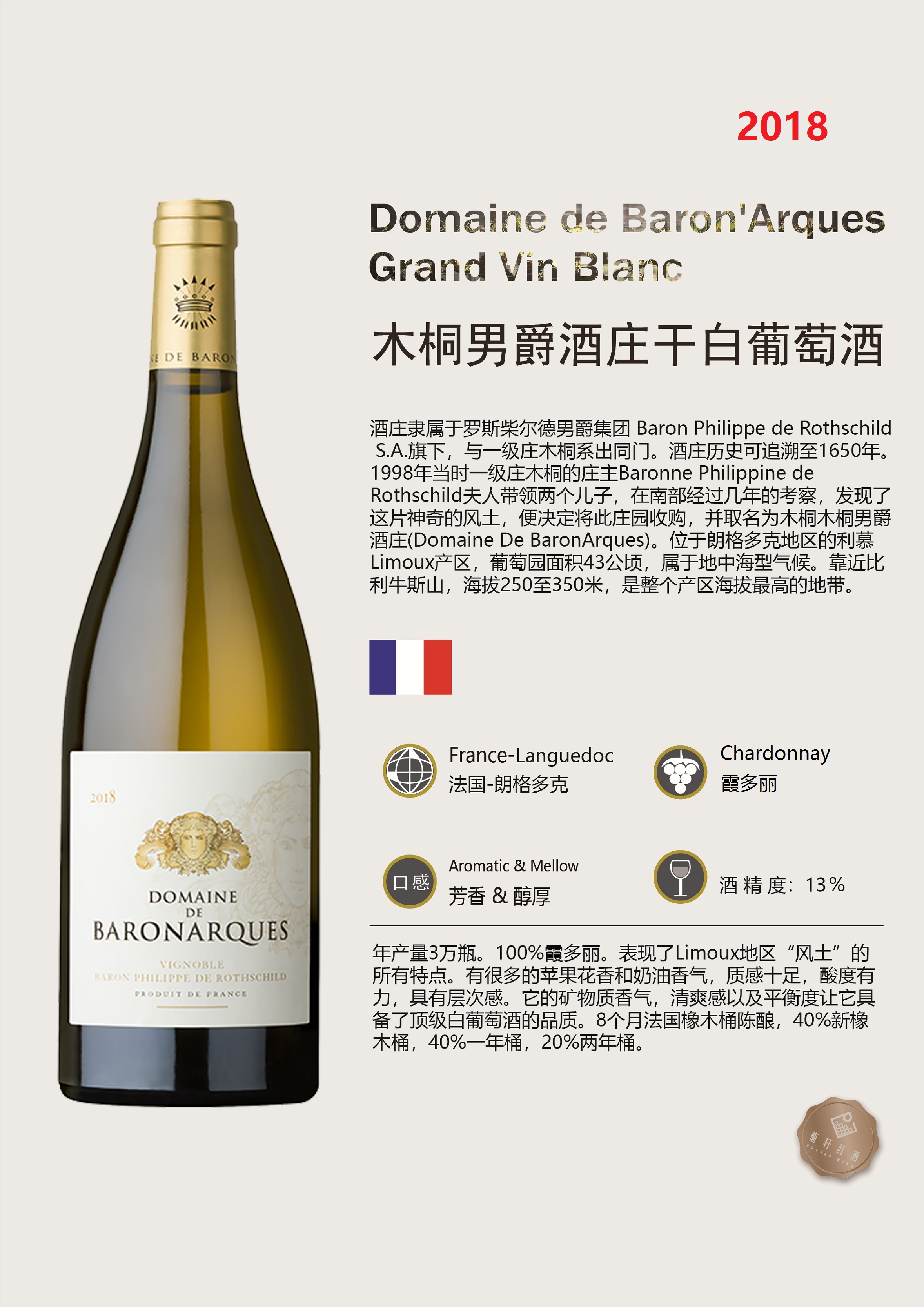 橡木桶陳釀時間 | 酒精發酵和之后的陳釀都在橡木桶中完成,時間總長為9個月 | 葡萄采摘年份 | 2016/2018年 | 產品類型 | 干白葡萄酒 |