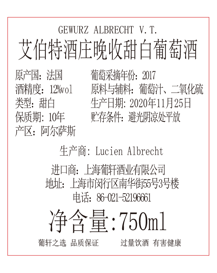 葡萄品種 | 瓊瑤漿GEWURZTRAMINER | 酒精度 | 12% | 酒體 | 中等 |