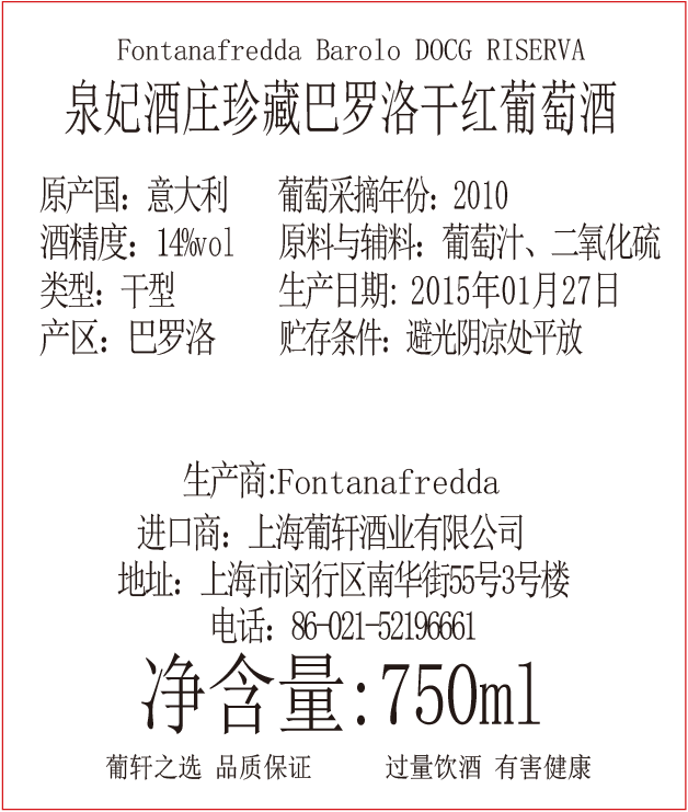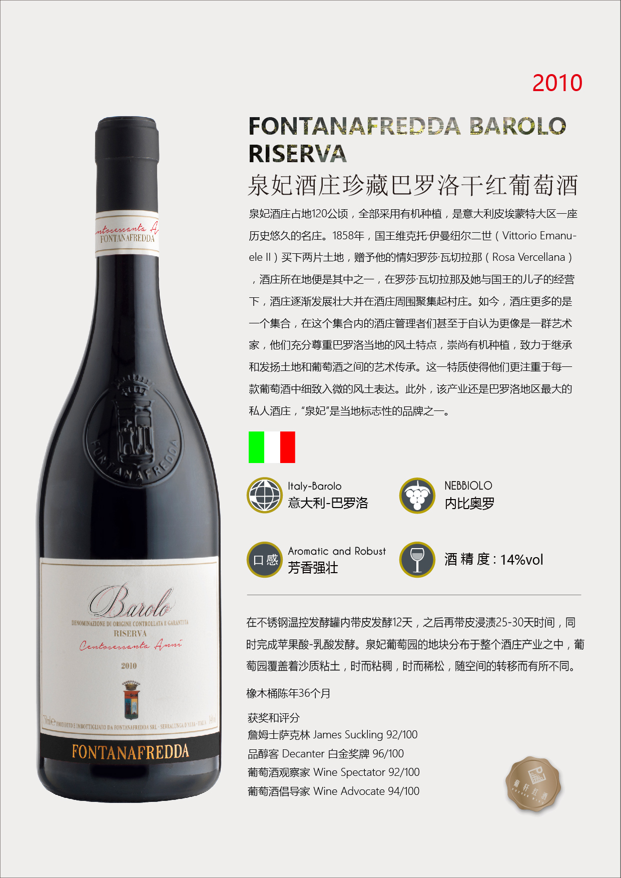 橡木桶陳釀時間 | 36個月 | 葡萄采摘年份 | 2010年 | 產品類型 | 干紅葡萄酒 |
