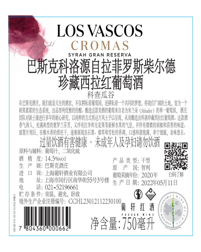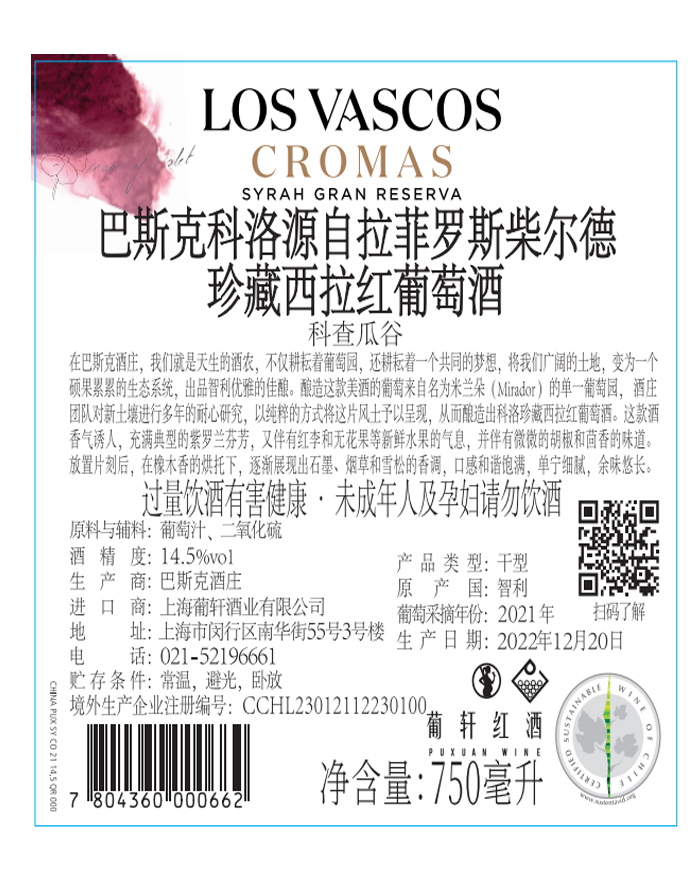 酒體顏色 | 紫色 | 包裝規格 | 6/紙箱 | 口感 | 芳香強壯 |