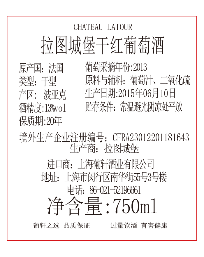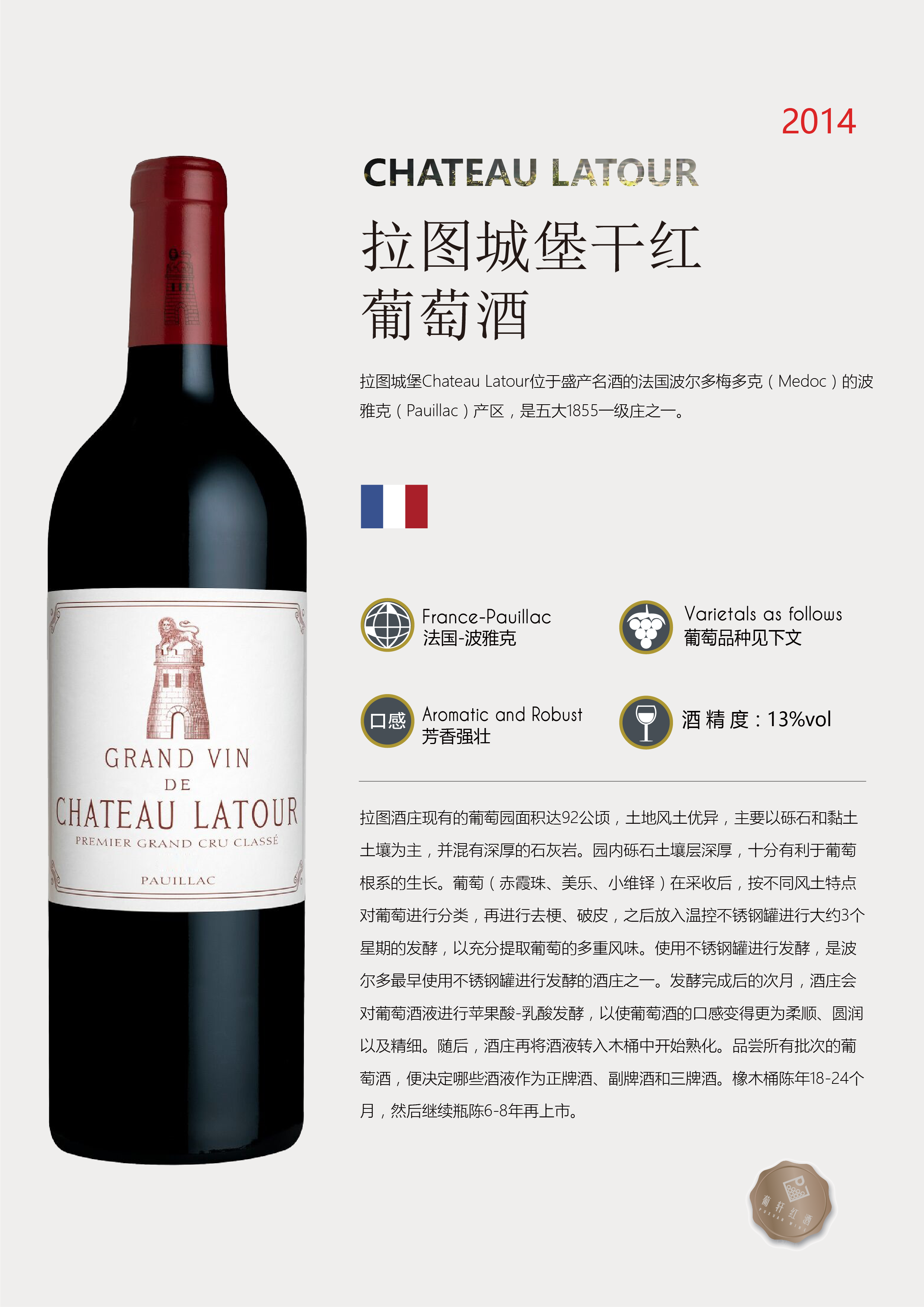 賣(mài)點(diǎn) | 波爾多1855分級(jí)(1855 Classification)中,被評(píng)為一級(jí)莊 | 級(jí)別 | AOC | 酸度 | 中等 |