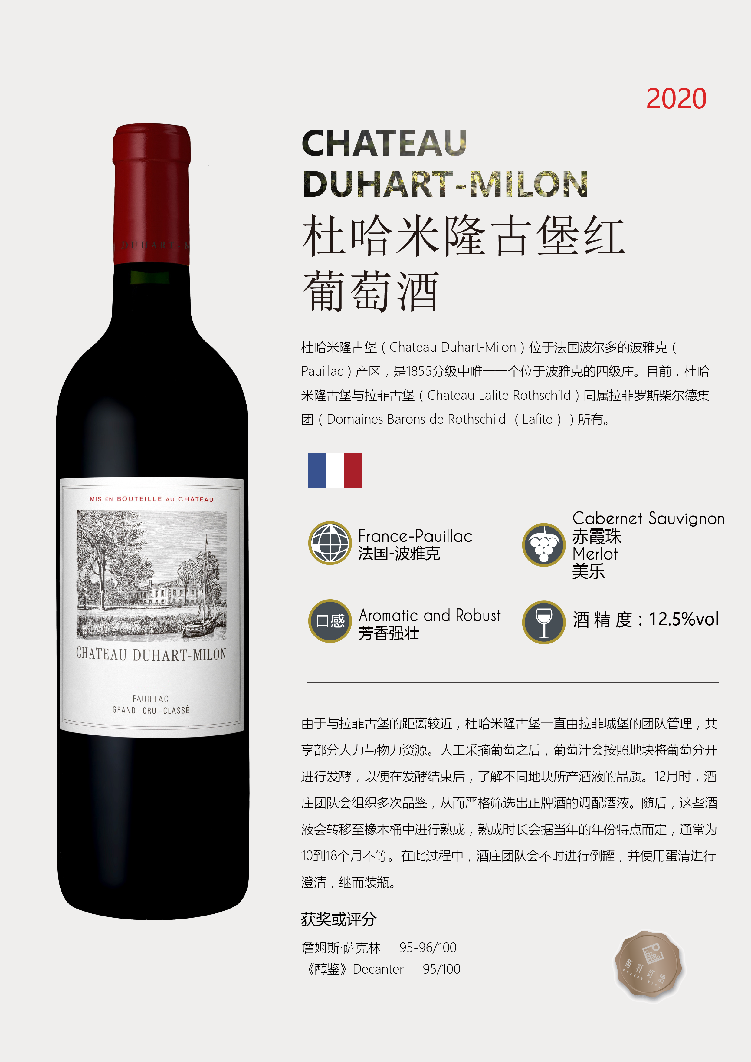 榮譽/評分 | 詹姆斯·薩克林 95-96/100 醇鑒Decanter 95/100 | 品嘗溫度 | 產品規格 | 750ml | |