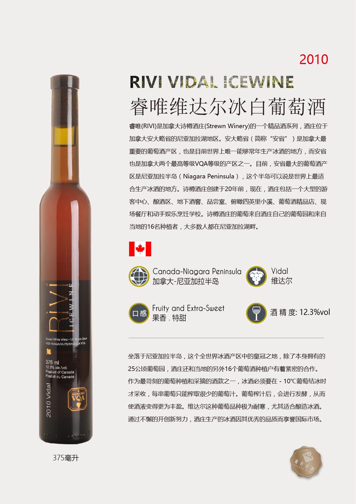 品飲記錄 | 這款冰白葡萄酒采用100%威代爾釀制,散發著經典的蜂蜜、檸檬和柑橘等香氣,帶有純凈且濃郁的柑橘類水果、油桃、花朵和堅果的風味,口感甜美醇厚,同時又有充足的酸度與之平衡,非常適合為新鮮水果、蛋糕等甜點佐餐。 | ||||