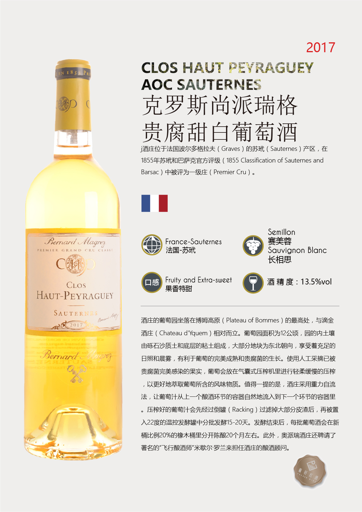 賣點 | 1855年蘇玳和巴薩克官方評級(1855 Classification of Sauternes and Barsac)中被評為一級莊(Premier Cru) | 級別 | AOC | 酸度 | 中等 |