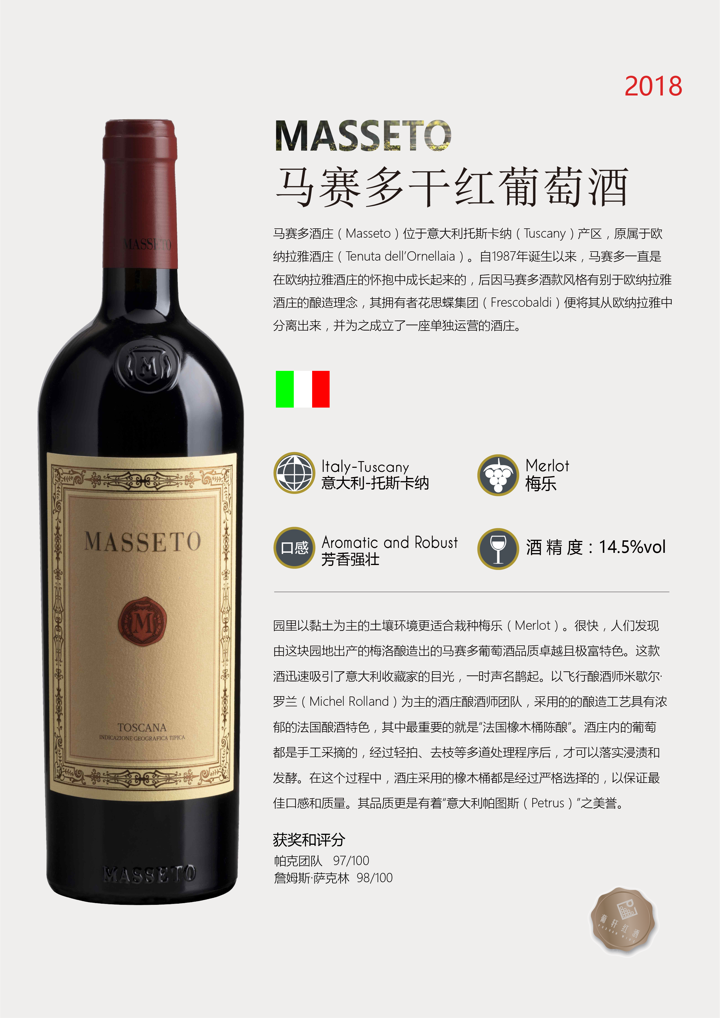 品飲記錄 | 這款酒由100%梅樂釀造而成,酒液呈深寶石紅或深紫紅色,常伴有黑莓和黑醋栗等果香,有時還會伴有烘烤咖啡和香草味,酒體中等,架構堅實,余味優(yōu)雅悠長,陳年潛力十分優(yōu)秀。它優(yōu)異的品質使它獲得了許多酒評家的青睞,詹姆斯·薩克林(James Suckling)曾專門撰文夸贊過馬賽多,稱其“足以與帕圖斯(Petrus)和里鵬(Le Pin)等傳奇葡萄酒相媲美”。 | ||||