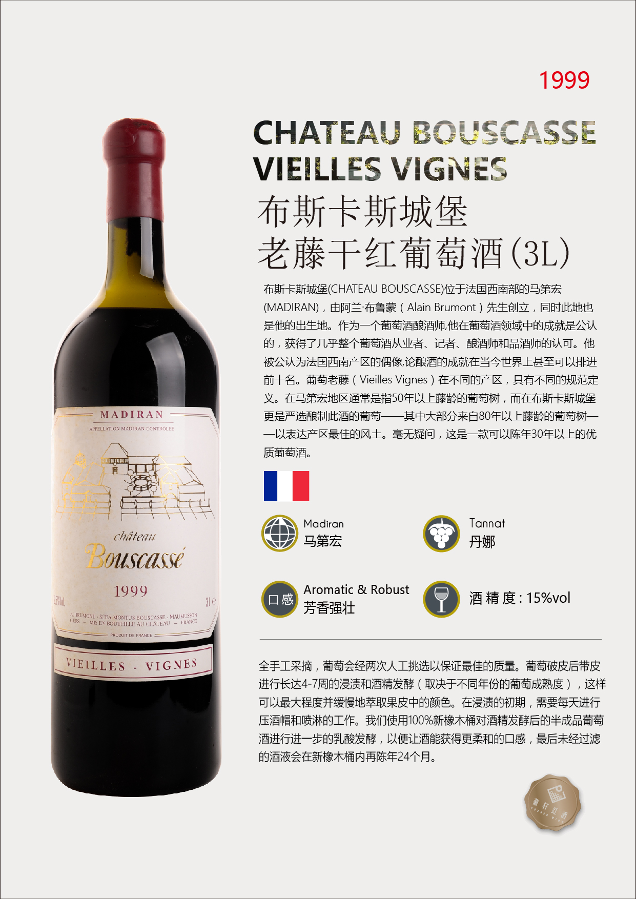 酒體顏色 | 寶石紅色 | 包裝規(guī)格 | 1支/木箱 | 口感 | 芳香,強(qiáng)壯 |