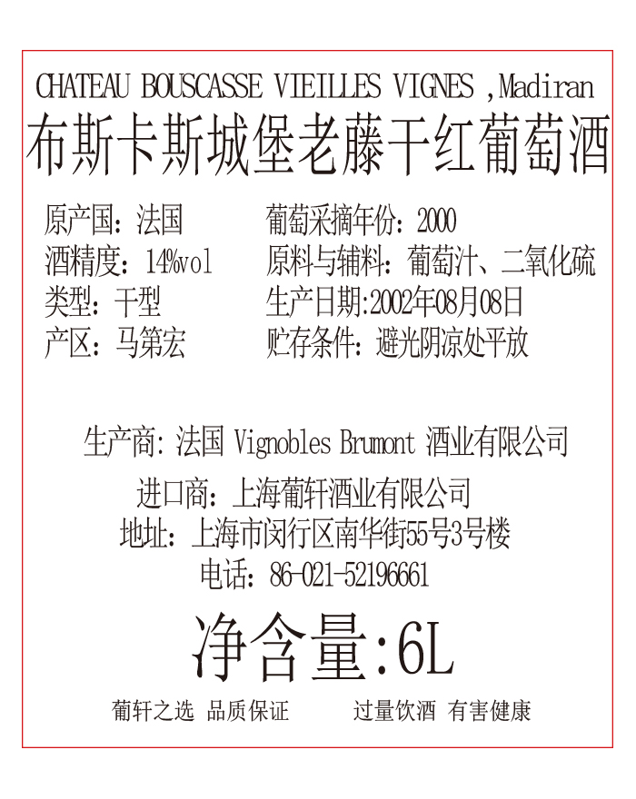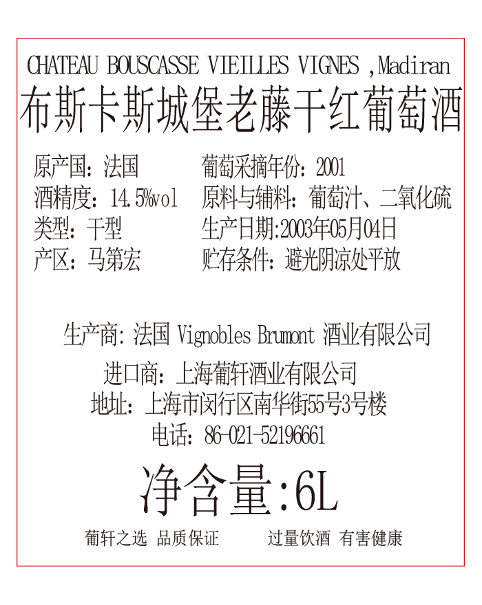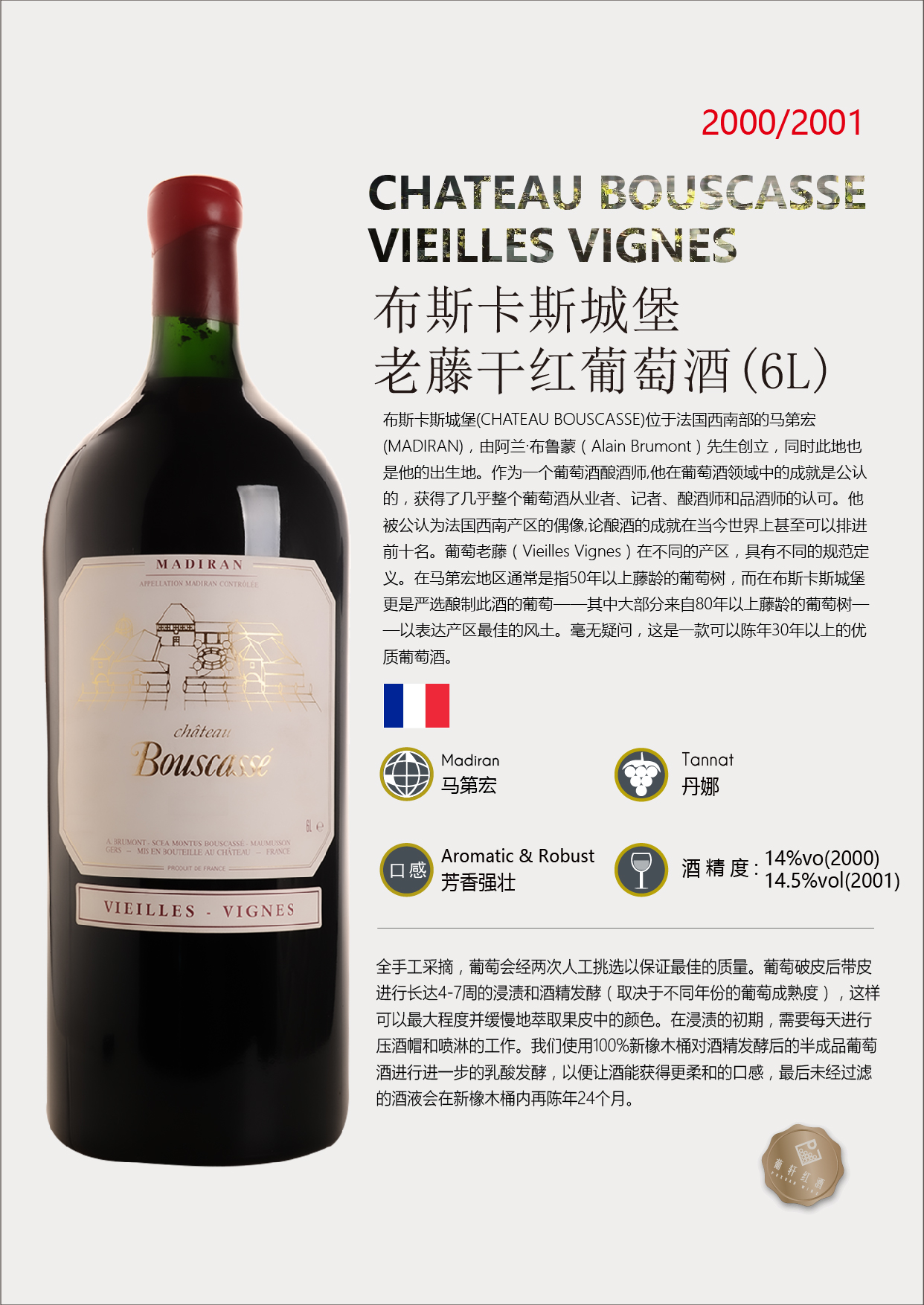 橡木桶陳釀時間 | 24個月 | 葡萄采摘年份 | 2001/2000 | 產品類型 | 干紅葡萄酒 |