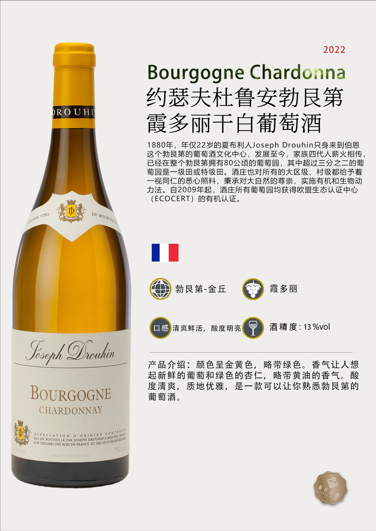 品飲記錄 | 果味濃郁且風格經典。顏色呈金黃色,略帶綠色。香氣讓人想起新鮮的葡萄和綠色的杏仁,略帶黃油的香氣。酸度清爽,質地優雅。 | ||||