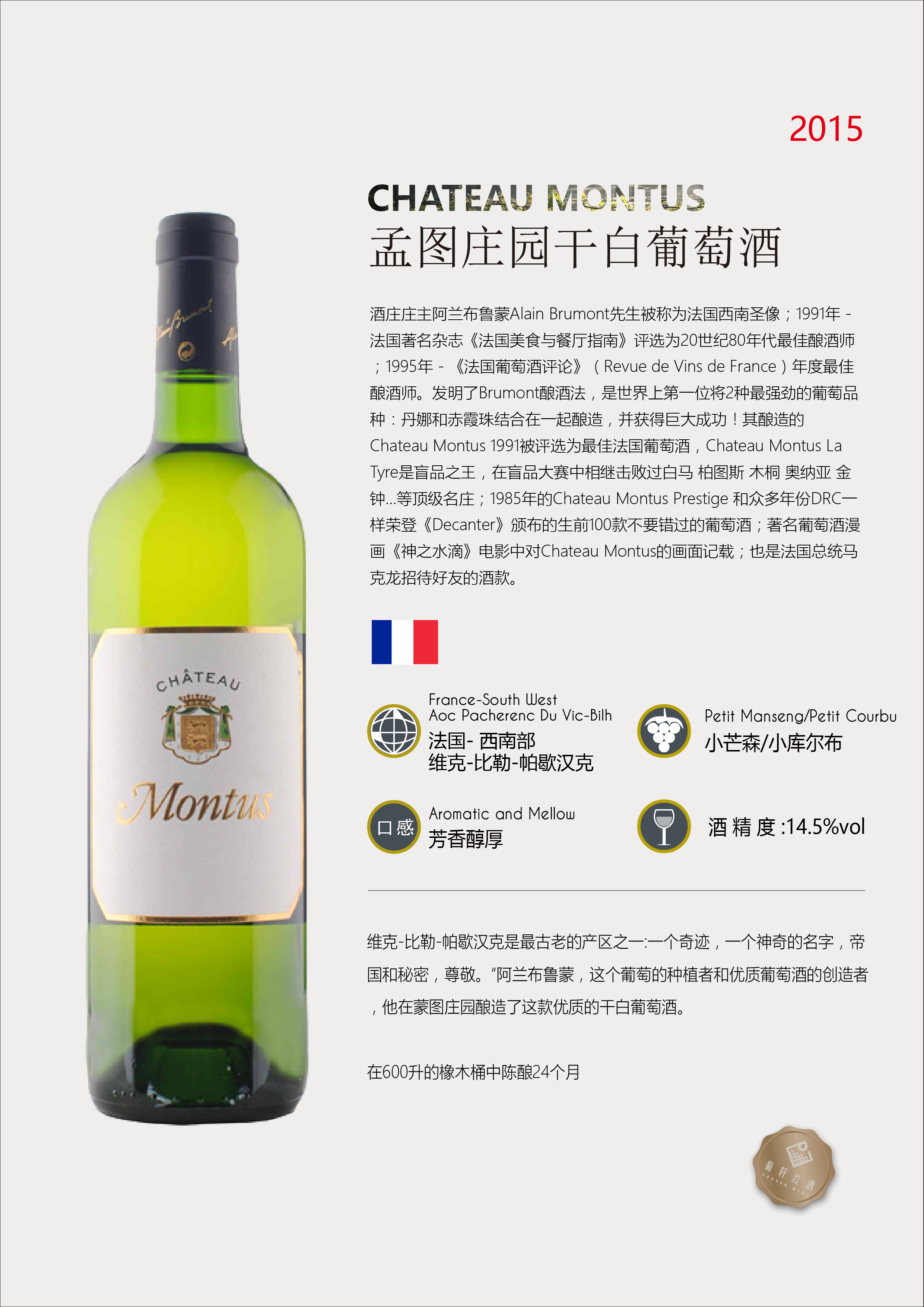 橡木桶陳釀時間 | 在600升的橡木桶中陳釀24個月 | 葡萄采摘年份 | 2015年 | 產品類型 | 干白葡萄酒 |